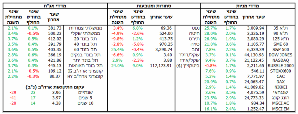 המחצית השנייה של השנה ממשיכה במגמה כלכלית של צמיחה יציבה. המשק האמריקאי ממשיך להציג כלכלה יציבה ושוק עבודה שמתרחב לצד אינפלציה שנשארת גבוהה מהיעד של הפד. יפן, האיחוד האירופי ודרום קוריאה הגיעו להסכמי סחר מול ארהב שמורידים את רמת אי הוודאות. בישראל האינפלציה נשארה גבוהה ובהתאם הציפיות להפחתת ריבית נדחו שוב. הנתונים הראו את הפגיעה ממבצע עם כלביאאך זו עשויה להיות נקודתית. קריסת המשא ומתן לסיום הלחימה בעזה שחק במעט את העליות במדדי המניות.