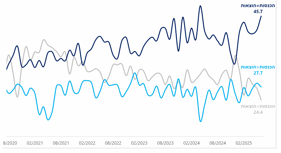 אחוז משקי הבית בישראל שההכנסות גדולות מההוצאות במגמת ירידה