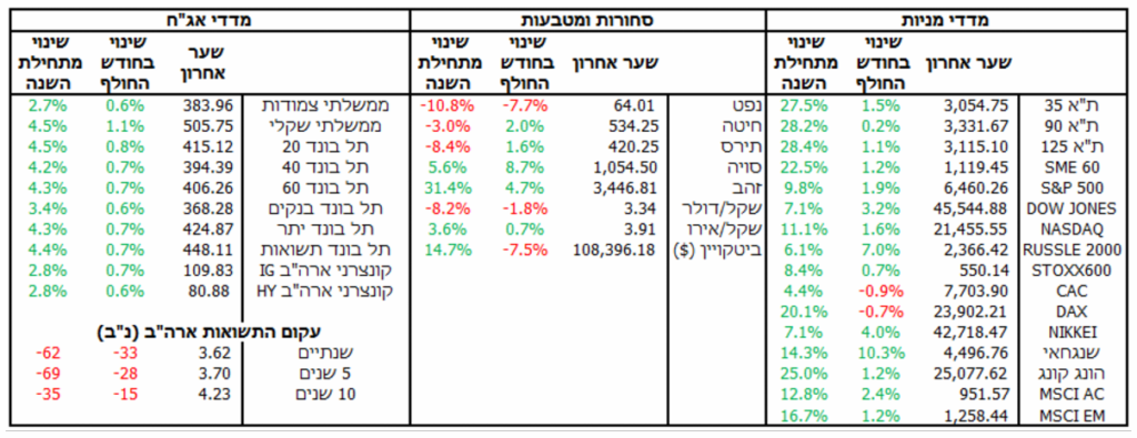 חודש אוגוסט בארה“ב היה רווי בסימנים לכך ששוק העבודה האמריקאי בבעיה, מה שהביא לשינוי בגישת הפד והגדיל את הסיכוי להפחתת ריבית בספטמבר. פגישות טראמפ עם פוטין ולאחריה עם זלנסקי ומנהיגי אירופה הגבירה את הציפיות לסיום המלחמה בין רוסיה ואוקראינה אך רק באופן זמני. בישראל הבורסה סיימה בסופו של דבר עוד חודש חיובי למרות שהנתונים הכלכליים מצביעים על כך שהמשק מתקשה להתאושש כל עוד המלחמה נמשכת.