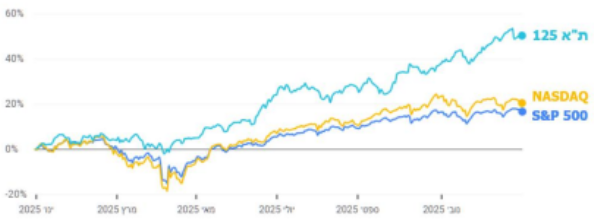 בישראל הבורסה המקומית הציגה שנה שנייה ברציפות של תשואות מובילות ביחס לעולם, הן במדדי המניות והן במדדי האג”ח הממשלתיים והקונצרנים. התשואות הגבוהות נתמכו בתחושת היציבות וחזרת המשק לשגרה לאחר סיום המלחמה, מה שהוביל להפחתת פרמיית הסיכון ולציפיות לגידול בצמיחה. גם התחזקות השקל מול סל המטבעות תרמה לביצועי השוק המקומי, כאשר זה ירד ב1.8%- בדצמבר ובסך הכול ב8.4%- מתחילת השנה .